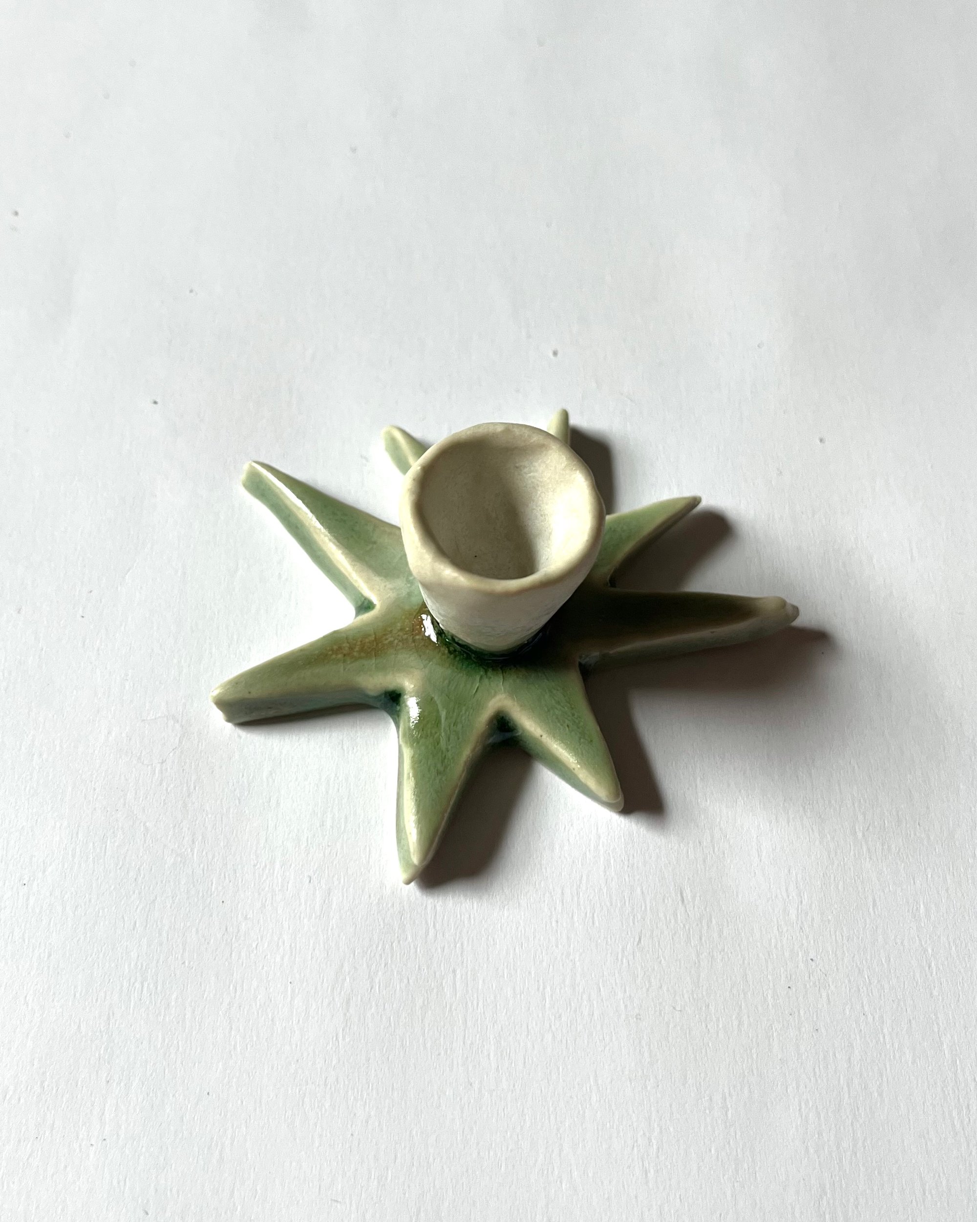 A singular stoneware candleholder in cloudy matte white & earthy vernal green.